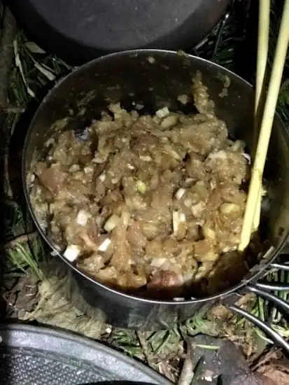 薪を集めて焚火をしながら飲み始めたところ、雨がポツポツと降り出した。今まで天気は持ってくれたが、天気予報通り下り坂の為直ぐにタープ下に移動し宴を再スタート。