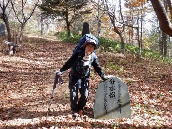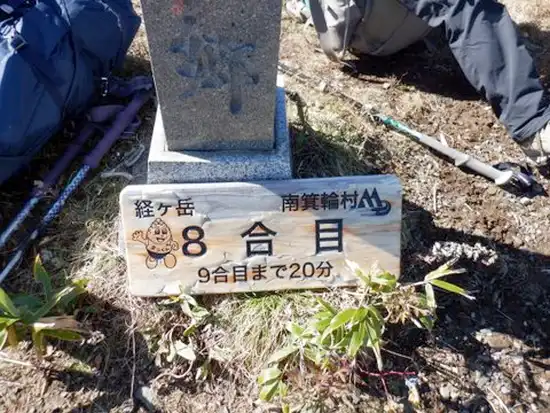 経ヶ岳の登山道はよく整備され、特にキツイ登りは無いが、長い。2,300mの山はこんなに登るものか、各合目表示の『松ぼっくりのまっくん』に励まされ、紅葉を楽しみながら高度を上げていったが、途中からハプニングが...。