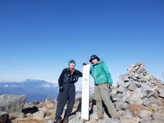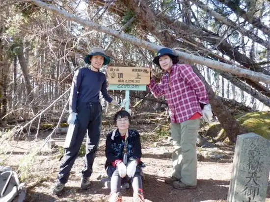 結局山頂に着いたのは14時近く。13時までの予定を立てていたのでこの先、水場がある権兵衛峠までは難しくなった。持ち水を大切にと伝え、記念写真を撮りすぐ出発。