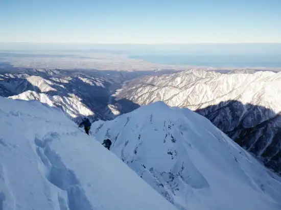 別山尾根から早月尾根に乗る分岐からの下降は滑落事故が多いところなので、懸垂下降で慎重に降りる。獅子頭は別パーティーが登りで付けたトレースを使って巻いて降りる。その後も急な雪壁がいくつか出てくるが、後ろ向きになってピッケルを効かせながら慎重に下降。2,650mあたりのいくつもの残置シュリンゲがあるところで最後の懸垂下降を終えるともう安全地帯だ。