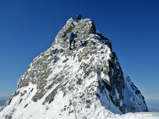 獅子頭を過ぎると山頂までは一投足だ。やさしい岩と氷化した雪のミックスとなっている急なルンゼを登ると別山尾根に合流し、ここから距離にして50mほどで祠のある待望の頂上に到着する。