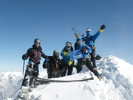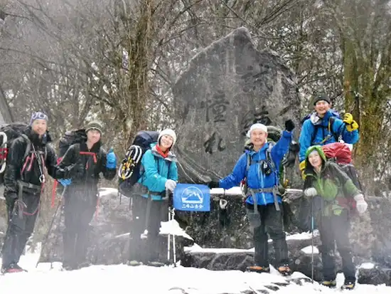ゆっくり休憩をとって小屋まで各自適当に降りる。小屋で幕を張っている長野の山岳会(5人パーティー)に終始ラッセルして頂いたお礼を言う。山岳警備隊からウッチーが声を掛けられ、三峰山岳会の6人パーティーが登頂し、無事に小屋まで降りて来たことを報告する。結局この日は、3パーティー、計15名が登頂を果たすことが出来た。小屋から30分ほど下って、昨日暗い中頑張って設営した立派な幕場に戻る。勿論、夜は盛大な宴会となる。
