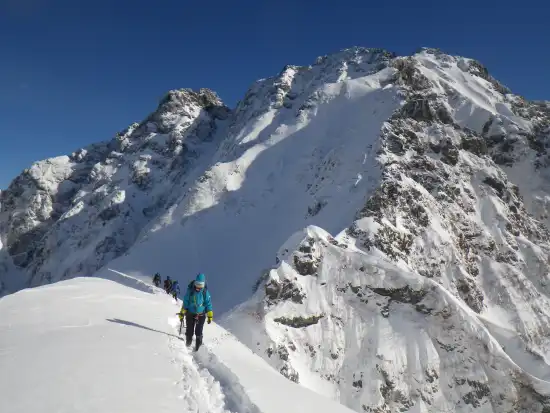 2,650mあたりの急登をこなし(帰りは懸垂下降)、その後も急な雪稜や草付きを登っていくと獅子頭の取付きに到着する。ここはこの時期のセオリー通り直登して、頭から懸垂下降して夏のトラバース道に合流する。先行の5人パーティーも直登したが、次の4人パーティー(学生?)は左側からトラバースしていた。トラバースルートは雪が不安定だと滑落事故も多いところだが、今日は雪も安定していて問題なかったようだ。