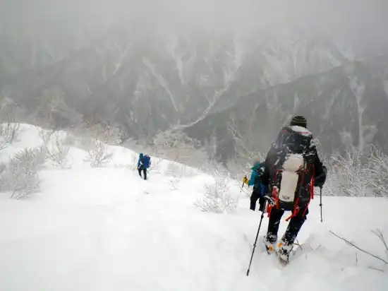 我々は7時半くらいに下山を開始。今日は低気圧が通過するので全国的に雨で気温も高い。幕場は湿った雪だったが、標高を500mも下げると雨に変わり、全身ビチョビチョになりながら降りていく。下山時は数多くの登ってくるパーティーとすれ違ったが、明日は寒気が入って強い冬型となるので、全身バリバリとなって、登頂を狙うのはかなり厳しい条件となるだろう。
