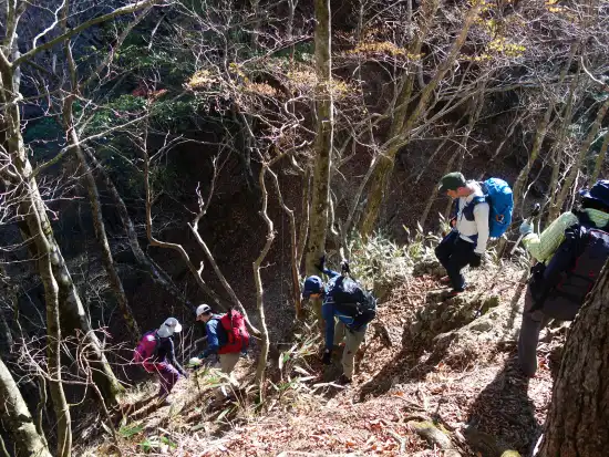 車のデポを待っている間に、単独行の方が降りてきて「1時間ほどのところで道が崩れていて断念してきた」と教えてくれた。我々も迷ったが、リーダーの「行ってみましょう」のひと言で気持ちを切り替えて歩き出した。はたして、1時間弱の地点で沢が大規模に崩れていて道は跡形もなく消え去っていた。だが対岸には踏み跡も見えており、お助けロープも持ってきていたので崩壊した斜面を降りることになった。道祖土さんが一番手で斜面をクリアすると次々とメンバーも沢に下り立って先を目指す。