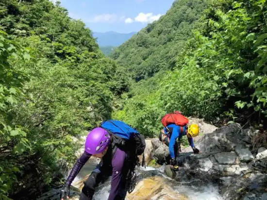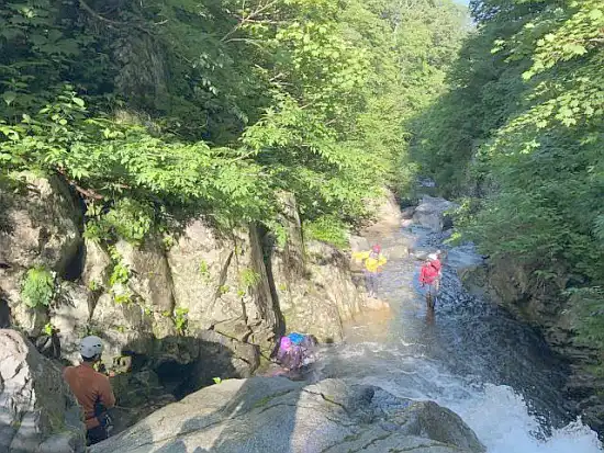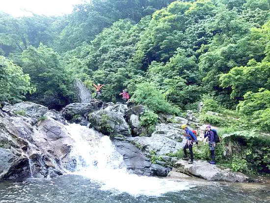 その後もいくつもの滝とぶつかる。シャワークライミングも経験できたが、前日までの雨の影響で水量が多く、爆流となっている箇所は高巻いた。