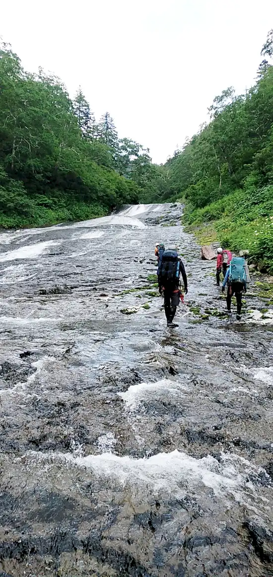 クワウンナイ川へ入り、何度か渡渉を繰り返しながら進む。膝下の水量だが流れがあり、重荷を背負っているためバランスが崩れやすい。数名で組んで渡渉した。