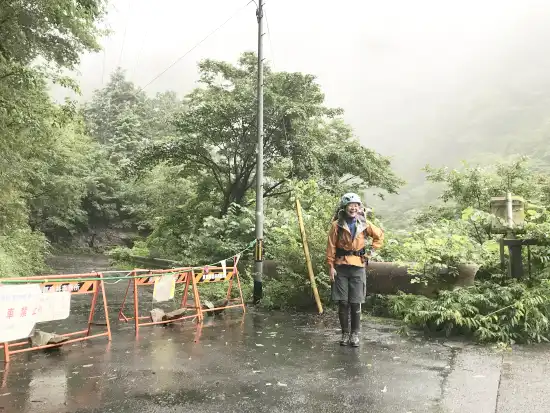 倉沢橋7:30路面崩壊の為、通行止めで中に車を止めることが出来ず少し離れたところに駐車した。リーダーのオレンジのカッパが通行止めの看板とかぶって作業員にしか見えない。