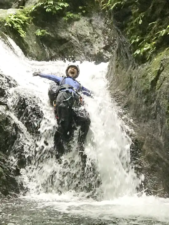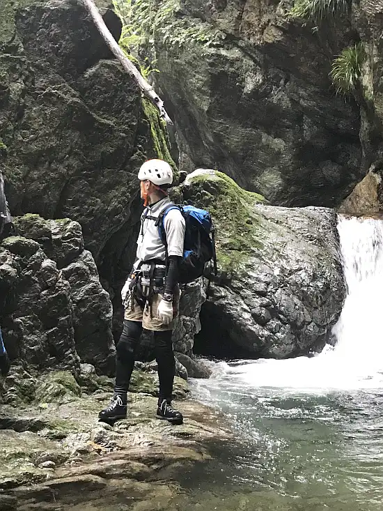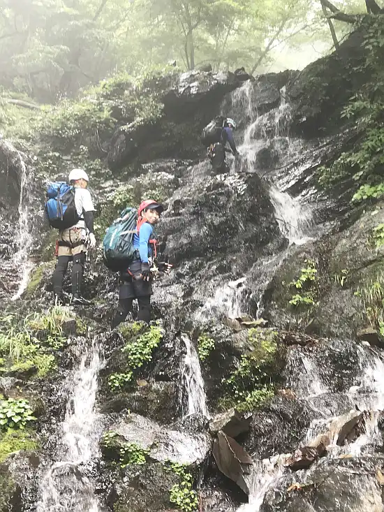 泥付を降りて沢に戻るが、直ぐに右岸を巻く。残置ロープが張ってあるが、より安定していそうなルートをリーダーが登りそれにつづいた。沢に戻り休憩を挟みながら暫くいくと、左から岸壁を滴り落ち流れ込んでいる沢が現れた。小ガッコー沢だ。千葉の2016年の記録にもあったが本当に変な名前だ。この辺から調子に乗ってハシャギまくり、登れる小滝は積極的に登った。野畑さんは冷めた目で見ていたが、「修行だ!」等と言って順番に滝行をして写真を撮る。リーダーの緊張はこの辺で崩壊したように感じた。完全に私の功績だろう、感謝して貰おう。