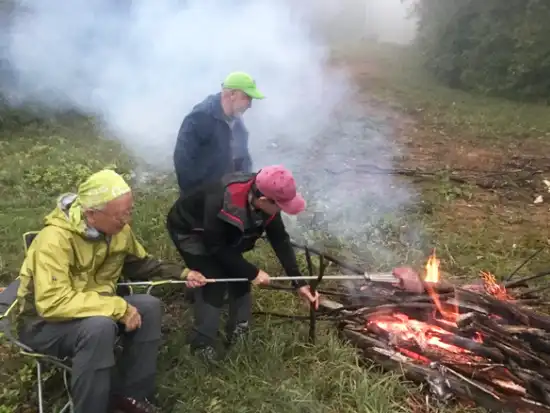 当日は飯田橋駅の肉そば屋さん前で集合。午前6時30分だというのに、朝シャッターが開くとすぐにお客さんでいっぱいになった。朝食はここでも良かったねと箭内さんと話していると、天城さんや明さんが登場し車に乗り込み移動。途中で別所さんとも合流し、コンビニでお酒を買いつつ、沼尻登山口に到着。雨風凌げる秘密の場所にテントを張り、みんなで焚き火用の枝を集めて、昼食の素麺を啜る。