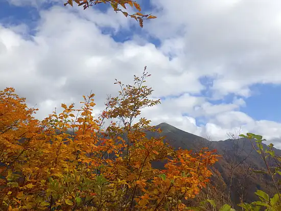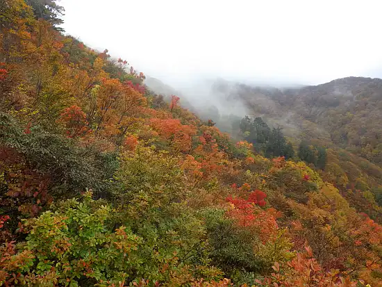 急斜面を下って上り七ツ小屋山まで戻り、あとは蓬峠を経由して下山。蓬峠付近は一面熊笹で、風になびいており、ジブリの世界のようだった。蓬ヒュッテからは前日歩いた稜線の西側の燃えるような紅葉を見ることができた。標高が下がってくると、紅葉の樹林の中を歩き、更に標高を下げると、新緑のような緑と黄色く色づいた樹林の中を下山した。