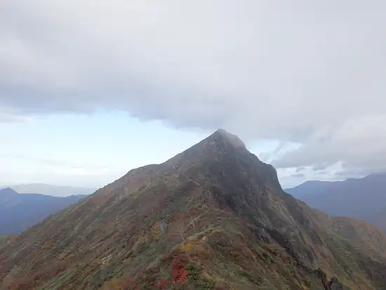 翌朝2人組が5:30に小雨が降る暗いうちに出ていった。我らは雨があがった6:30出発。空はどんより曇っていた。大源太山が見える稜線に出ると、徐々に雲は晴れてきた。七ツ小屋山まで来ると、雲はすっかりとれ、大源太山が全容を見せた。これが日本のマッターホルン?眼下にあるせいか、小さく見える。七ツ小屋山からの急斜面を下り、急斜面を上り標高1,598mの大源太山の山頂に立った。前日の雨が丁度山頂付近の1,600mから上に雪化粧を施していた。巻機山も真っ白だった。