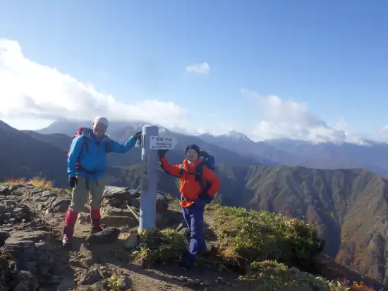 白毛門山頂はそこそこ人がおり、皆山頂からの紅葉を楽しんでいた。我らもひと休みしてすぐに、笠ヶ岳に向かった。笠ヶ岳に向かう人は殆どおらず、当初から同じペースで歩いていた女子2人組だけだった。山頂からは女子2人組に先に行ってもらい、我らはのんびり朝日岳に向かった。