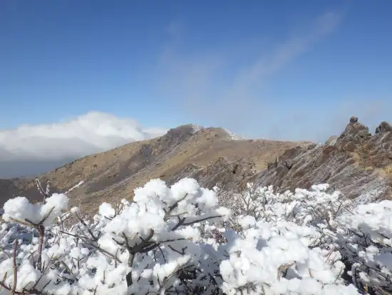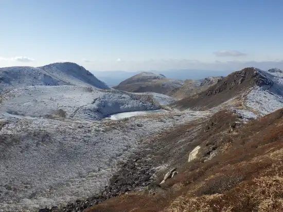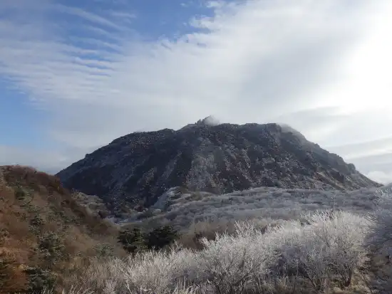 今日も快晴だ。法華院温泉から、来た道を久住別れまで戻り久住山避難小屋、星生山(ほっしょうざん)を経由して赤川温泉に下山した。星生山の南斜面は太陽にあたってポカポカだが、北斜面は真っ白な樹氷となっていた。