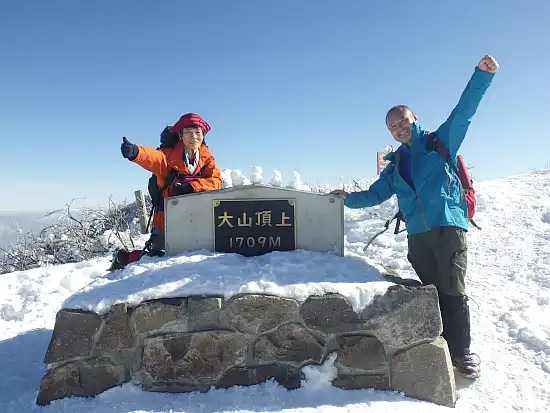 今日は大山登山である。明るくなる7時に宿を出発。駐車場に車を置き、駐車場近くの登山口からスタート。3合目近くなると登山道が凍ってきて、そろそろアイゼンを用意しなくてはと思ったとき、アイゼンを車から出したところまでは覚えているが、ザックに詰めた記憶がないことに気づく。案の定、ザックにはなく、一人車に戻ることになった。アッコさんとは6合目の小屋で待ち合わせ。30分くらいのロスで戻れた。6合目はすっかり雪山状態。宿で用意してくれた朝食代わりの爆弾おにぎり弁当を半分食べて、頂上を目指す。途中ヘリがホバリングして誰かを救助していた。あとで聞いた話だと、滑落とかではなく体調が悪くなりヘリ搬送となったとのことだった。山頂付近になると、なだらかになり木道らしきルートにしっかりトレースがついていた。青い空に純白の雪がまぶしい。山頂から戻る人とすれ違うのにトレースから少し離れると、木道から外れ、雪に埋まる。軽いあっこさんは被害なし。山頂の標識の場所は最高点ではない。最高点に行くには通行止めのロープを越えてボロボロに崩れかかった細尾根を少し行かなくてはならないが、危険なので、この場所を山頂としているそうだ。記念写真を撮って山頂直下の小屋で一休み。今年建て替えしたらしく、中も外もピカピカだった。