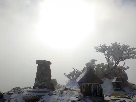 薄曇りの中、祖母山登山のため、道の駅高千穂を出発。北谷登山口には、すでに数台の車が止まっており、一人が車のナンバーを見て、東京からですか?と驚いた様子。北谷登山口から千間平、国観峠経由で山頂を目指した。国観峠付近になると霧氷がうっすらと出てきて、山頂に着くとくるぶし位の積雪になっていた。山頂にはひとり登山者がいた。写真を撮ってくれとのことで、スマホを受けとると、いきなり地べたに横になった。?。この姿を撮る?変わった人だ。