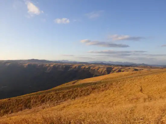 下山後、すぐに阿蘇に向け出発。阿蘇は快晴だった。まだ日暮れには時間もあることから、阿蘇大観望に行ってみた。夕暮れ時で外輪山に囲まれた眺望は素晴らしかった。九州の山で会った人が口を揃えて、今の阿蘇は火星みたいと言っていたのが、納得した。樹木がなく、枯れた草原が広がり、火星のクレーターの中にいるような景色だ。