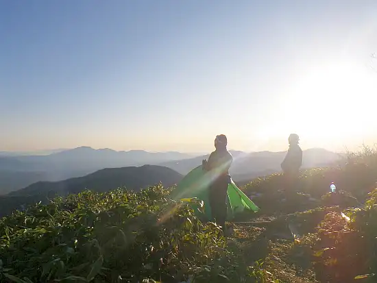 360度の眺望と雲ひとつない夕景に、こんなテン場で張れるなんて最高だねと3人で笑顔を交しあった。頂上も前日までの雪で少しぬかるんでいたので、周りに生えていた笹の葉を引きちぎって簡易のグラウンドシートを作りテントを張った。その日は前夜祭的に少しお酒を楽しみ、美しい夕焼けと星空の下眠りについた。