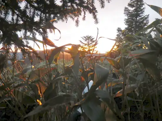 そして期待はまたも粉々に。最初の30mほどは膝ぐらいの笹になって、「久しぶりに歩きやすいね」などと笑っていたのだが、登るにつれて根曲り竹が復活。山頂方向はさらに鬱蒼としている。それでも仕方ない、ピークを目指すのみ。傾斜が緩んできて、さあ幕場探しだと意気込んだが、そんなものはどこにもない。諦めてむりやり竹を押しのけて張ろうとしたところで、偵察に行っていた及川さんが「ありました!」と絶叫。なぜかポッカリと根曲りが生えていない空間があった。斜めだし、木は生えているしだったが、その時の我々には極上のキャンプ場のように見えていたと思う。急いでテントを移設して、取るものも取りあえずテントに転がり込んだ。全員、しばし呆然。10分ほど経っただろうか。日が落ちて、あたりが暗がりに沈む。危なかった。
