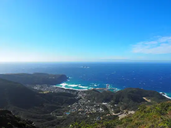 今晩お世話になる民宿菊乃屋さんのご主人に車で迎えにきて頂き、宿に荷物を置いたら早速登山スタートです。11:00黒島登山口から登山開始。登り始めてすぐに森林限界を超えたような背丈の低い立木になり開けた景色になっていきます。30分ほど登るともう稜線につくので下を見ると青い海と青空の素晴らしいコントラストが見えます。なかなか本州で綺麗な海の見える山には登らないので新鮮な気分に。