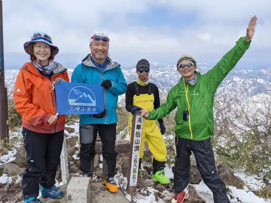 山頂で記念撮影後、前岳手前まで移動して、いよいよ滑降だ。先ほどまで曇りだった空も青空になっており、絶好の撮影日和だ。YouTubeで見た恐らくムジナ沢源頭部であろう動画が素晴らしかったので、同じような動画を撮ろうと、源頭部を200mほど一気に滑り降り、順番に皆のロングな滑りの動画を撮ることにした。離れた場所でもコミュニケーションが取れる無線は便利だ。無線で連絡をとって、ハギー、らっち、おぎの順番で滑降。青い空、真っ白な雪面に小さな点が徐々に近づき、最後は大満足な笑顔の大滑降が撮れた。