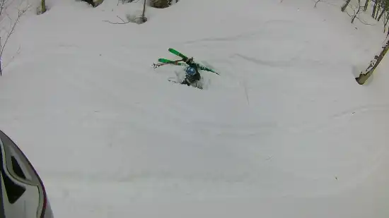 谷に入ってからが、雪が軽く最高だった。ちょうどいい間隔のぶな林の間を降りる。ゲレンデでの練習の甲斐があったのか以前より転ばなくなったが深雪には慣れない。引き続き少年のように声を上げて喜んで降りる男たち。先行者のトレースだらけと覚悟していたが蓋を開けてみるとラッキーなことに雪はまだ踏まれていなくて、ふっかふかの雪面を三峰で堪能した。知らないうちにスノーバスケットがなくなっていてストックがどこまでも雪のなかに刺さり雪の深さを感じる。雪の浮遊感を噛みしめてふわりふわり(という気分で実際はへっぴり腰で)降りて行くとあっという間に雪が重くなり、傾斜がなだらかになって、あっという間に国道に戻って来た。