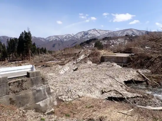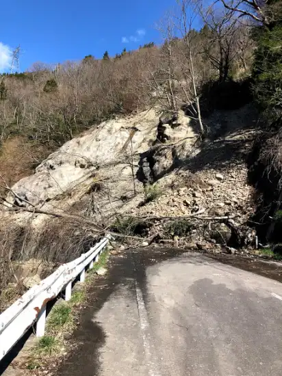 ブナオ峠まで行く県道福光上平線が崩落で通行止めであることは知っていたが、車は通れなくても歩いて通過できるだろうと思っていた。念のため管理センターへ電話確認したところ、法面崩落で入らないでほしいとのこと。諦めきれず下見に行ったところ、新たな崩落もあり歩いて渡るのはリスクがある状態だった。仕方なく、計画を桂湖大畠谷の吊橋から夏道登山道に入り大笠山へ登るルートへ変更した。