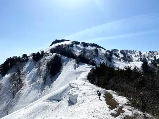 笈ヶ岳から仙人窟岳へは、さらに240m程度下りて150mほど登り返す。途中、中宮温泉から冬瓜山経由で登ってきた男性2人組とすれ違った。山中に入って初めての人との遭遇だ。このような山で会うと、「この人も同志だな」という気がして、思わず笑顔になってしまう。本山行中に出会ったパーティーは、この一組だけだった。