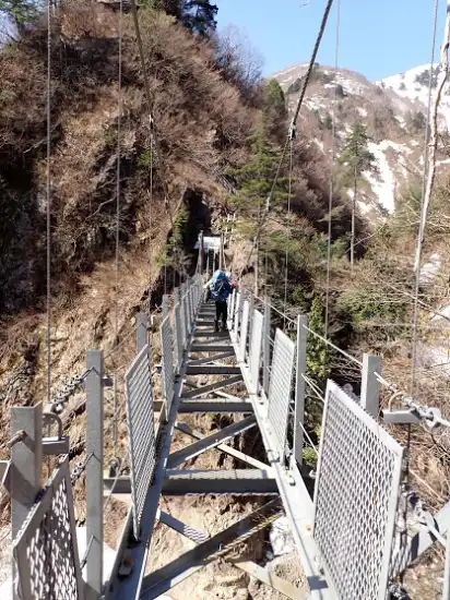大畠谷の吊橋は、冬季の間橋板が跳ね上げられており、橋ゲタに足を置きながら慎重に通過する。揺れないので無心で渡れば怖さはあまりないが、不安な場合は手すりのワイヤーで掛け替え通過もできる。