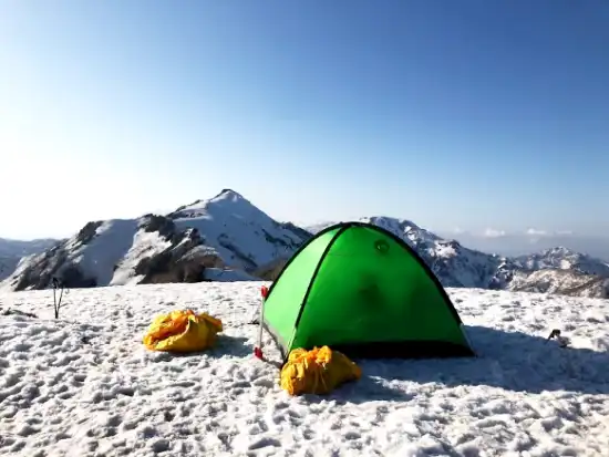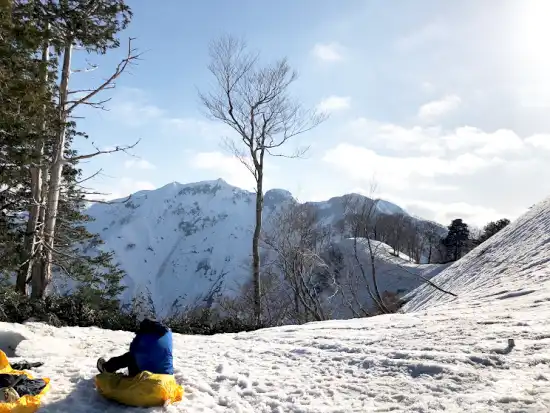 前笈ヶ岳の後のコルを越え、1,552mピーク手前の広くて平らな場所に出た。ピーク越えはそれなりの斜度で、午後になり雪も緩んでいるので、この素敵な幕場で本日の行程を終了することにした。テントを張り、無風なので外にツエルトを敷き乾杯する。良い眺めだ。笈ヶ岳も明日歩く稜線もすべて見える。軽量化のために泡系を担がなかったことを悔やんでいたら、大田さんが貴重なビールを分けてくれた。喉に炭酸が染み渡る。翌日は3時起床5時出発と決め、16時半にはテントへ入り、津田さんのスープカレーで疲れた身体にスパイスを入れ、満腹になって19時半には眠りについた。夜の間も風には吹かれなかった。