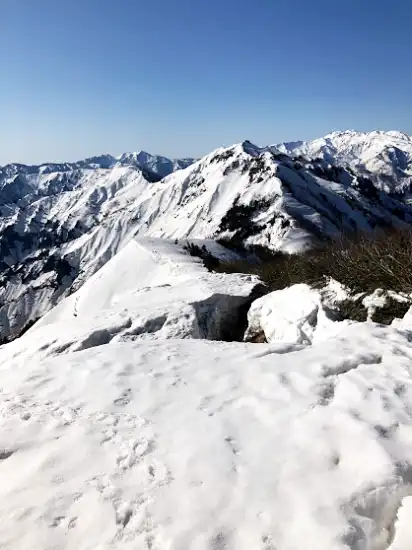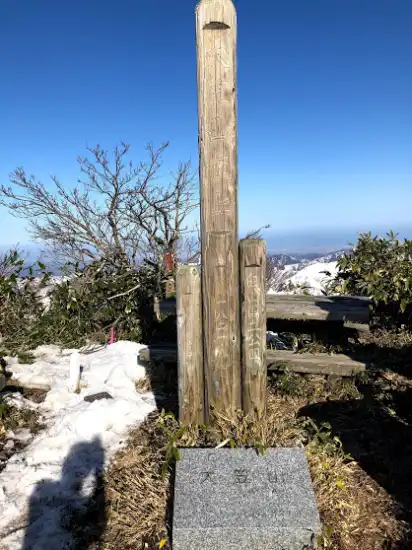笈ヶ岳山頂は狭いが、そこだけ雪がない不思議なピークだった。野生動物に削られたのだろう山頂標識を触り、改めて笈ヶ岳に来たのだと実感して感動する。素晴らしい眺め。自分の足で繋いできた稜線を振り返り、深山の空気を肺いっぱいに吸い込む。来てよかったと、心から思った。
