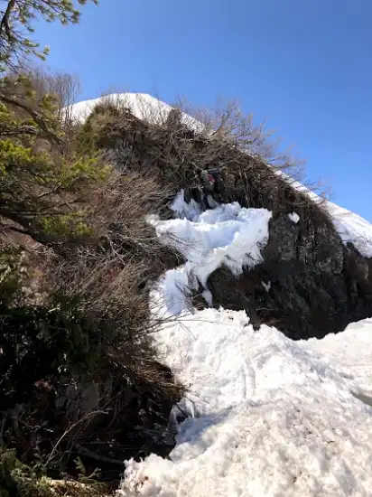 国見山までは前日同様、クラックに気を使いながら200m下り150m登る。その間に小ピークがあるので、縦走ならではの反復登り返しが待っている。途中何度かクラックを避け藪を漕ぎながら、国見山へ到着した。