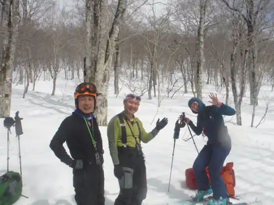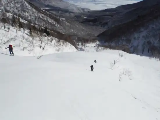 まずはコルまでガリガリの尾根沿いを慎重に滑る。コルからは最初だけ固いアイスバーンだが、すぐに柔らかい雪質に変わり本日最高の滑りを満喫する。しかし200mも滑ると雪は重くなり始め、しまいに最悪のモナカ雪へと変わってしまう。モナカ雪はスキー・コントロールがほぼ不可能な山スキーヤーの天敵なのだ。それでも頑張って標高を下げるとザラメ状の雪に変わり、雄大な北東斜面の滑降を楽しむ余裕が出てくる。やがて傾斜が落ちてもうひと滑りするとあっという間に氷沢川との出合だ。これで夢にまで見た乙妻山・北東斜面のスキーはお仕舞い。雪質はあいにくのコンディションでお世辞にも良かったとは言えないが、絶景の中のオープンバーンであのスケール、そして心地よい傾斜が延々と続く斜面はなかなか無い。雪の状態の良いときに再訪したいスキールートNo.1と言っても過言ではないだろう。氷沢川出合からはシールを付けて幕場までゆるゆると登っていく。幕場からはもうひと滑りあるが、幕営装備一式を背負って疲れた体で細尾根を滑るのはなかなかしんどい。ようやく林道に出ると、あとはただ立っているだけでスキーが勝手に大橋まで連れて行ってくれた。