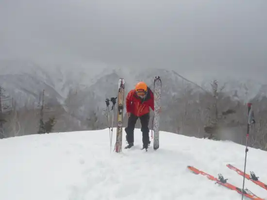 今日は佐渡山・南のコルで幕営なのでゆっくりの出発だ。雨が止んだ頃、大橋を9時に出発。雪は例年のこの時期と比べてかなり少ない。3時間弱で予定の幕営地に到着。まだ昼前なので時間潰しも兼ねて佐渡山の山頂へ。KGとみーこさんはテントでゆっくりしたいとのことで、もきちさんと二人で出発。行って戻って約1時間のお手軽ツアーだ。ほどなく山頂に到着、ここから幕場までの滑りは思ったより雪が良く結構快適だった。そして長い夜はいつものバカ話しであっという間に過ぎていく。