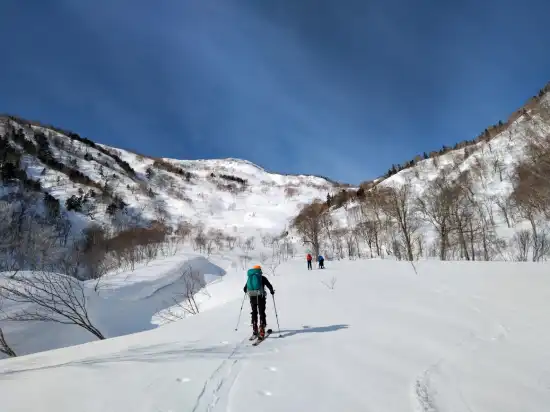 昨日の高温で緩んだ雪は今朝の放射冷却でカチカチだ。コルから氷沢川の源頭部に滑り込むが、ガリガリで先が思いやられる。すぐに左岸に渡り、左岸沿いに乙妻沢の出合を目指す。出合から乙妻沢沿いの斜面がいわゆる乙妻山・北東斜面と呼ばれており、頚城山塊屈指のスキーパラダイス斜面なのだ。と、いってもここにリフトがある訳ではなく高度差1,000mほどの急斜面をひたすら自分の足のみで上がっていく。