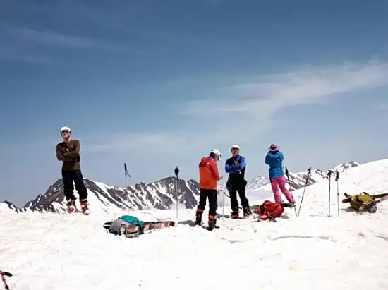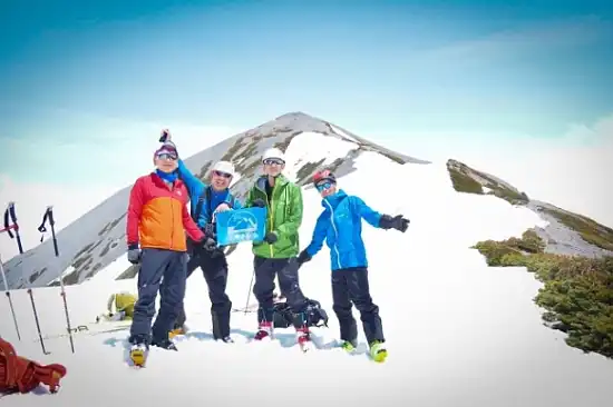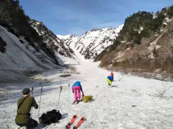 このルートの石の多さには閉口したが(板を傷つけたメンバー多数)、3,000m級の北アルプスの稜線からダラダラした傾斜が一切無く、一気に下まで滑り込めるルートはやはり魅力的で板納めに相応しい楽しいツアーになりました。