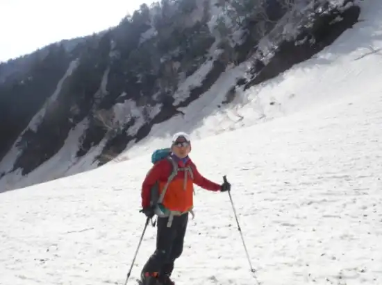 前夜に扇沢駅で仮眠。6時に出発するが既に5時過ぎから続々とスキーパーティーが入山していく。やはりこの時期の大人気スキーエリアのようだ。歩き始めはシートラで大沢小屋に向かう作業道沿いに登っていき1時間弱でシール歩行となる。マヤクボ沢との出合から上は傾斜もきつくなってきて、水分を多く含み良く滑る雪に苦労しながらもシールのまま針ノ木峠に這い上がる。