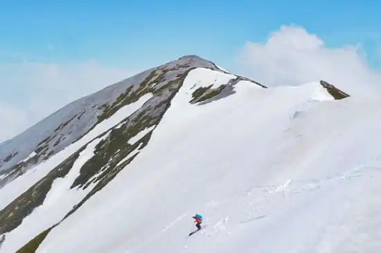 ここからはシートラで北アルプスの稜線漫歩を楽しみながらの天上ハイクだ。1時間程度で蓮華岳手前の西のコルに到着。ここにスキーをデポして山頂へ。山頂までは一投足だ。私にとっては30年振りくらいの蓮華岳からの360度展望を満喫し、西のコルに戻っていよいよ滑降開始だ!