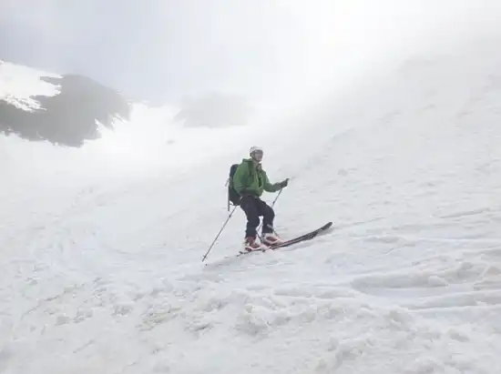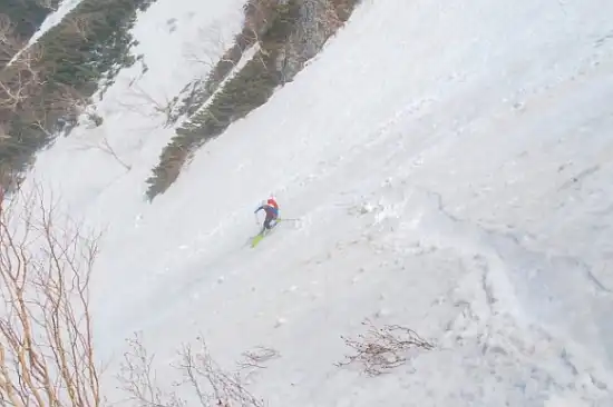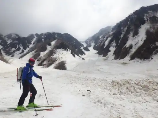 滑降ルートとなる大沢右俣は水平距離で2km、標高差1,100m、最大斜度40度ほどの急峻なルンゼ滑降だ。滑り始めると明日の悪天を先取りして下からぐんぐん雲が湧いて来て、やがてホワイトアウトとなる。また先頭が滑ると同時に大規模なスラフがダラダラと落ちていくので、一人ずつゆっくりと慎重に降りていく。しばらくしてノド(ルンゼの狭い部分)を通過したあたりから視界が効くようになりスラフも落ち着きひと安心。下部はデブリ地帯となるがスキーを脱ぐほどでは無く、そこそこ快適に滑れて針ノ木雪渓へと合流した。
