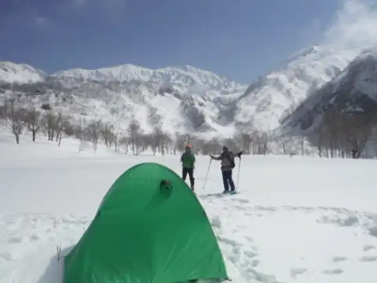 天気予報によれば午前中は冬型で悪天。なので東所沢駅に朝に集合して出発。12時前には能生ICを通過して笹倉温泉の駐車場に到着。準備をして颯爽と出発する。しかし背中の幕営装備は重く、九十九折りの林道沿いのルートは雪で埋まっており斜度の強いトラバースを強いられてなかなか大変。幕営予定地のアマナ平まで2時間で見ていたところを3時間半もかけてようやく到着する。ここは真っ平の広大な雪原が広がっており、いつかの風吹大池を彷彿とさせる幕場であった。誰もいない静かな夜、満点の星空、周りを囲む頚城山塊のシルエット、そして旨い酒と愉快な仲間たち、いつもながらの最高の夜が更けていく。