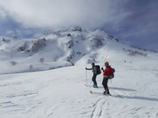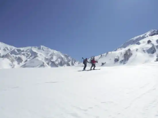 傾斜が強くなる1,920m地点にスキーをデポ。ここからはアイゼン・ピッケルに代えて更に上を目指す。あわよくば山頂までと思っていたが2,100mあたりから傾斜は更に強くなり、登りはなんとかなっても下りはロープが必要なコンディションになってきたので、ここであっさり山頂はあきらめる。我々はこの広大な斜面を滑りに来たのでこれでいいのだ。スキーデポ地点に戻り、準備していざ滑降開始だ!