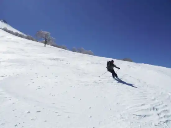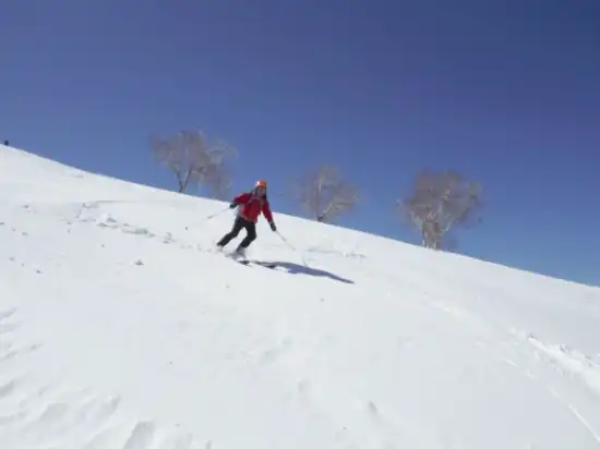 心地よい傾斜の広大な斜面をひたすら滑っていく。雪もまずまずだ。滑りだすとあっという間ですぐに終わってしまいそうなので、1本とってこのロケーションを十二分に味わう。満足したころに後半戦を開始し、やっぱりあっという間にアマナ平に戻ってくる。