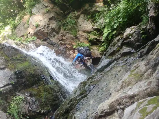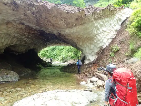 出発して間もなくもう一つの懸垂が必要な滝がでてくる。大きな釜を持つ滝だ。懸垂で降りて少し下ると雪渓の残骸と共に薄くて崩壊寸前のスノーブリッジが出てくる。これは潜るしか方法がなく足早に駆け抜ける。
