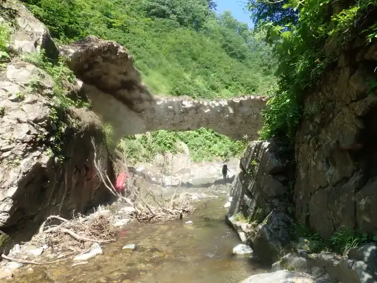 展望台から車道を10分ほど登り、橋の南端のガードレールを越えると小尾根上に踏み跡がありこれを辿る。フィックスロープも付いているが急傾斜なのでかなり厳しい。橋の下の河原に降り立つのにかなりの時間を要してしまった。一息入れてから溯行を開始する。