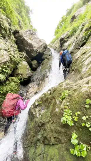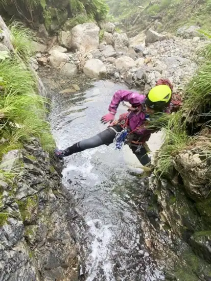 7時に石抱橋を出発。入渓点迄1時間くらい林道を歩くが、すぐに藪となってしまい、快適なところは少ししかなかった。8時に入渓。しばらくは川原歩きだ。膝上くらいまで浸かると、水温の低さに、雪渓の存在が頭をよぎった。今年は雪が少なかったので、雪渓は殆どないと思っていた。暫く行くと魚止めの滝だ。ここは右のルンゼの草つきを高巻く。つかめる木が上部にしかないため、そこまではバイルを使って慎重に高巻いた。梅ちゃんは初めてのバイルで使い方がわからなかったようで、後ろのヨコチンが突っ込みを入れていた。しばらく進むと二俣に到着。ここで9時。持参したガイドにはここから4時間で登山道とあったので、15時位には登山道に出られるかなぁと呑気に話をしていた。