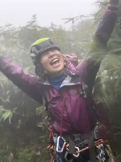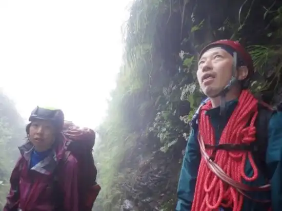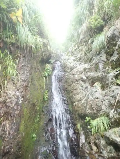 この先には15m4段、4mトイ状の滝と全く休ませてくれるところがないのだ。滝の数を数えず、ただひたすらに登って行ったら、いつの間にか1395mの最後の二俣に到着していた。ここを右に行くと百草ノ池で最短で登山道に出られるが、左に行って10mの滝を越えると藪漕ぎなしで登山道にでるという記録を信じ、左に進んだ。ところが、上部に行くと急斜面で濡れた根曲がり竹の藪となってしまった。根曲がり竹を掴みながら、何とか登山道に到着。ちょうど18時だった。何とか暗くなる前に登山道に出ることができ、安心した。