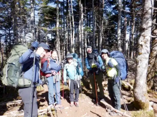 準備をして、紅葉を見ながら平坦な林道を歩き始め、登山口である易老渡に到着した時には、徐々に晴れ間も見えてきて、気温もちょうどよく、いい感じで登り始めましたが、易老岳までは、急登もあり、重いザックが体にこたえました。