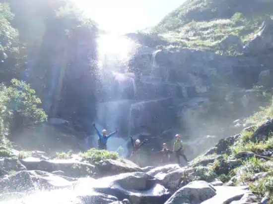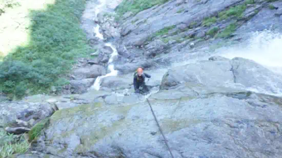 落差に加えて傾斜もあり、圧巻のスケールだ。ここも定石通りで左岸沿いに少し上がったところからロープを出して水流に向かって斜め上に伸びる階段状のバンドを上がっていく。至る所に残置ハーケンがあり、登攀自体も容易だ。しかし今日は水量が多いようで登攀ルートに沿って水がじゃぶじゃぶ流れており、せり出した岩のだいぶ手前からシャワークライミングとなる。40mロープで行くが一段目と二段目を分けるテラスまでは届かず、その5mほど手前でハーケンを打ってピッチを切った。2ピッチ目はすぐ上のテラスで一旦ピッチを切る。