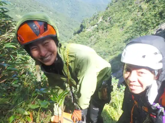 しばらくすると右側に15m大滝が出てきて、ここは定石通りロープを出して右壁に走る斜上バンドを使って登るが、出だしすぐの外傾しているところが滑りそうで怖いのでハーケンを1本打ってから落ち口に抜ける。ここからすぐで早くも東ゼン最大のハイライトなる60m大滝のお出ましだ!