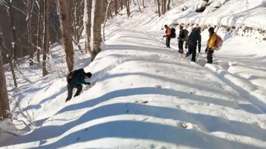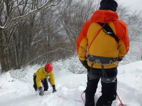 まだ終わるには早いということで、少し休憩した後はその他の支点の作り方を学んだ。土嚢に雪を詰めて埋める、枝を埋めての支点作りやスノーボラードを行った。斜面に沿った向きに対して力をかけていれば、かなりの力がかかっても耐えられることがわかったのは大きな学びであった。雪の状態や装備に応じて臨機応変に対応したい。